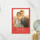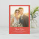 This wedding thank you card features a warm and inviting design with a soft peach and cream color palette, creating an elegant and modern aesthetic. The layout is divided into two sections, showcasing a beautiful photograph of a couple in formal attire during sunset, complemented by a solid red background for the text area. The typography is crisp and legible, with "Thank You" written in an elegant script font, enhancing the heartfelt message. The overall mood is one of celebration and gratitude, making it perfect for expressing thanks to guests after a memorable event.