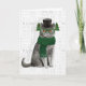 En berömvärd grått-katt av brittisk Shorthair-ras är utplånad för säsongen i ett par grönt Julgran-glas, ett svart top hat och en grönt vinterscarf mot en fuktig ord-konst och ett lustigt helgdag för kattälskaren.