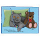 Cute grått British shorthair cat sitta med katt leksak och nalle. Katten hoppas att deras tidigare olycka som de har in i skylls på hund.