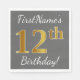 Den här enkla pappra napkin-designen innehåller ett meddelande som "FirstName's 12:e Birthday!", där "12:e" har ett utseende som liknar guld, faux/imitation, på en grått- (grått) färgad-bakgrund. Namn kan vara personlig. Den skulle kunna användas i en födelsedagsfest för någon som firar sin tolfte födelsedag. [~Z0000190]