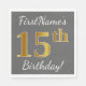 Den här enkla pappra napkin-designen innehåller ett meddelande som "FirstName's 15 Birthday!", där "15:e" har ett faux/imitation guld-liknande utseende på en grått (grått) färgad-bakgrund. Namn kan anpassas. Den skulle kunna användas i en födelsedagsfest till någon som firar sin femtonde födelsedag. [~Z0000190]