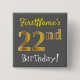 Den här enkla fyrkantiga knappdesignen innehåller ett meddelande som "FirstName's 22nd Birthday!", där "22nd" har ett utseende som liknar faux/imitation guld på grått (grått) färgad. Namn kan vara personlig. Knappar som dessa skulle kanske kunna bäras av gäster i en födelsedagsfest till någon som firar sin tjugoandra födelsedag, där party hålls i ett stort område med många andra närvarande personer (t.ex. en stadspark eller en temapark). [~Z0000192]