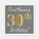 Den här enkla pappra napkin-designen innehåller ett meddelande som "FirstName's 30års födelsedag!", där "30:e" har ett utseende som påminner om guld, faux/imitation, på grått (grått) färgad. Namn kan vara personlig. Den skulle kunna användas i en födelsedagsfest till någon som firar sin trettioårsdag. [~Z0000190]