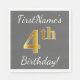 Den här enkla pappra napkin-designen innehåller ett meddelande som "FirstName's 4e födelsedagen!", där "4th" har ett utseende som liknar faux/imitation guld, på en grått (grått) färgad bakgrund. Namn kan anpassas. Den skulle kunna användas i en födelsedagsfest till någon som firar sin fjärde födelsedag. [~Z0000190]