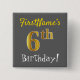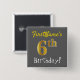 Den här enkla fyrkantiga knappdesignen innehåller ett meddelande som "FirstName's 6e Birthday!", där "6e" har ett faux-/imitation-guld-liknande färgutseende på en grått- (grått) färgad-bakgrund. Namn kan vara personlig. Knappar som dessa kan kanske bäras av gäster i en födelsedagsfest till någon som firar sin sjätte födelsedag, där party hålls i ett stort område med många andra närvarande personer (t.ex. en stadspark eller en temapark). [~Z0000192]
