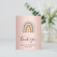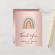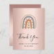 Ett tack för en 21:a (eller någon annan) födelsedag. En ro guld-faux-metall tittar bakgrund färg. Dekorerad med en modern abstrakt, minimalistiskt målad regnbåge med hjärtan i grått och mörk ro guld. På framsidan skriver stora svarta färgader skript och text: Tack, text, rubrik och datum. Tillbaka: Anpassa och lägg till tackkort och namn.
