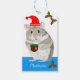 Den här vackra märkrn med julklappar för personliger har en söt fluffy Grått och vit Hamster som håller en present och bär en julhatt mot en vit bakgrund med Holly. Namn kan ändras.