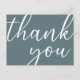 En skiffergrå bakgrund. På framsidan stor handskriven text med texten: Tack. Baksida: Mall för din tacknota och namn/namn. Tips: Om du inte vill att det ska se ut som ett vykort, klicka på anpassa, gå till baksidan och ta bort avdelaren och frimärket.