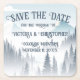 En mystisk grått-skog med romantisk vit dimma runt gräs träd och berget i bakgrunden gör en underbar vildmark Spara datum underlägg för en vinterceremoni i bergen. Elegantens typografi har alla socklar med en vacker namnteckning blomning på brev.