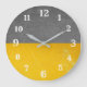 Modern väggklocka i fast färg av grått och gult med vita nummer.