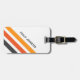 Baggagetagg med tre diagonala rand i mörk grått och två skuggor orange på vit bakgrund och ditt eget namn i ett fet, modernt sansserif-teckensnitt. Lägg till kontaktinformationen på baksidan.