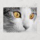 Bild av en grått- och vit katt med lite svart med vackert golden gult öga.