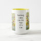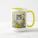 Folk art stil ai-konst som skildrar ett sött grått och vit katt sitta i gult och vita blommor. Söt kattcitat.