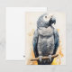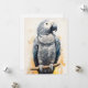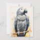 En detaljerad beskrivning av en papegoja som genomkorsas på ett gren visar på dess smala ludd mönster och slår öga. Mjuka nyanser av grått och blått accentueras med subtil vattenfärg stänk i bakgrunden.