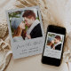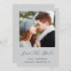 Det här enkla, minimalistiska Spara datumkortet innehåller ett fyrkantigt foto ovanför orden "Spara datum" i ett svart handskriftsskript i elegant, följt av parets namn, bröllop datum och stad i sans serif-teckensnitt på en blek grått-bakgrund. Lägg till ett mer detaljerat meddelande med ytterligare information om det omvända.