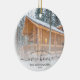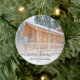 Minneshögtidlighålla er första jul i ert nya hem med denna vackra moderna keepsaksprydnad. Grått-texten från kol lyder "Första julen i vårt nya hem" med ord "nya hem" i handskriftsskript i elegant med blommor före och efter. Byt ut exempelbilden mot ett foto av ditt nya hus och lägg till familjens efternamn. Ett vitt övertoningsfilter hjälper till att göra så att texten visas.