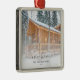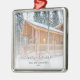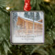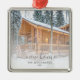 Minneshögtidlighålla er första jul i ert nya hem med denna vackra moderna keepsaksprydnad. Gråttet lyder "Första julen i vårt nya hem", med ord "nya hem" i handskriftsskript i elegant med blommor före och efter. Byt ut exempelbilden mot ett foto av ditt nya hus och lägg till familjens efternamn. Ett vitt övertoningsfilter hjälper till att göra så att texten visas.