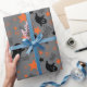 "Grått Sömlös Wrapping Papper med Spöken och stjärnor" utvisar fall där spöken rusar genom en natt himmel fylld med stjärnor, vid sidan av den festliga Halloween-ord som "boo" skapar det idealiskt för ett spooky firande.