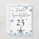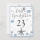 Grått Starfish Blue Snäckors Beach Wedding Bordsnummer Card. Två hjärtan i sanden, mörk blått bakgrund