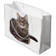 Grått tabby katt sitta nedåt, tittar på vit bakgrund