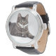 Porträtt i ett grått-stripe tabby katt sitta på vit bakgrund