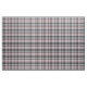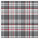 Grått texturerad tartan pläderas med tunt rött och blått rand.