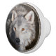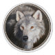 Ansikte av en grått-varg med klarorange öga. Realistiskt konstnärligt verk skapat från en ursprunglig oljemålning av häst- och vildlevande konstnären Crista S. Forest.