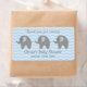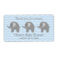 Klistermärken för vattenflaska av grått-elefant för babydusch. Anpassningsbar babyduschetiketter för vattenflaska med djurdesign i zoo och mönster-bakgrund i schevron. Personlig elegant DIY vattenburkdekmall. Snyggtens manustypografi för namn och födelsedatum för flicka eller pojke. Använda som klassad bord-dekoration eller tack för att ni kom till festen för gästerna. Genusneutral zigzag-design med anpassadets bakgrund färg, dvs. pastellblått, rosa, grått eller mjuk gult. Zig zag rand skriver ut.