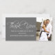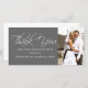 Ett fantastiskt fotokort för Tack i Bröllop med ett vackert, vitt skript-teckensnitt för ord "Tack" på en solid färg-bakgrund efter eget val. Här visas färg med grått-bakgrund med en enkel men elegant design för text och foto. Ett perfekt sätt att sända ett hjärtligt tack till gästerna i bröllop och ge var och en ett foto från bröllop om de nygifta. Utformning av Elke Clarke ©2011. Välj bakgrund färg och lägg till namn, meddelande och datum för bröllop. Byt ut det här exempelfotot mot ditt eget. Välj "anpassa den" om du vill ha mer flexibilitet för att placera och storlekt fotot och flytta texten till bästa kostym i layouten. Grattisar Nyliga Weds!