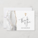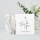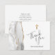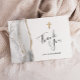 Tack vare det här kortet från den moderna första kommissionen i elegant finns ett grått och vitt vattenfärgat gräns som trimmas med guld faux glitter. En liten guld faux foil kor visas över ord "Tack" i ett grått-handskriftsskript med kol mot vit bakgrund. Anpassadet innehåller ditt barns namn på framsidan och ett redigerbart meddelande på baksidan med kursiv stil.