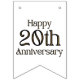 Denna girlang banner har orden "Happy 20th Anniversary" i ett unikt tryck typsnitt med svart kontur och gyllene bokstäver. Alla banderoller har enkelsidig utskrift utomhus säkra tillverkade av robust plast polystyren och tjock plast rep har (16) 5.5" x 8" svalor svans flaggor på en 6' lång sträng.