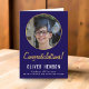Grattisar Enkelt blått Student-fotokort för Studenten. Elegant och enkel design med gyllene skript och anpassningsbar foto på blå bakgrund. Lägg till ditt foto och meddelande för student inuti kortet.