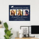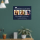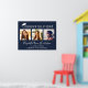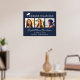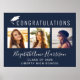 Modern mörk marinblå examensfestaffisch med "GRATULERAR" i vit typografi och en illustration av en vit examensmössa högst upp, en 3-fotocollage, hennes namn i ett snyggt vitt manus, och hennes avgångsklass och skola i enkel vit typografi. Bakgrundsfärgerna och typografin kan redigeras till din skolas färger genom att välja "redigera i designverktyget".