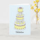 En flervånig rosa, vit och citrongul, glassad tårta, mot en pastell blå bakgrund. Bilden åtföljs av ordet "Lyckönskningar".