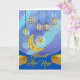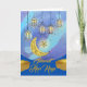 Selamat Hari Raya hälsningar för Eid al-Fitr skrivna på malajiska. Lyktor på natten ovanför en halvmåne och lysande stjärna. Akvareller blandade med svart penna och stänk av guld metalliska toner. Lägg till din egen vers inuti som du vill. Konst, bild och vers copyright Shoaff Ballanger Studios, 2022.