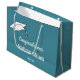 En vit examenshatt är ovanför den vita texten som lyder 'Grattis'. Du kan redigera texten om så önskas. Två rader med vit text visas under manusen. Du kan redigera dem för att visa examenens namn och årskurs. Gåvan är en retro nyans av blå som var populär på 1970-talet.