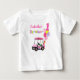 Denna t-shirt med en rosa prickig golfbil parkerad vid stigen, en födelsedagstårta och ljusa heliumballonger—med en stor nummer 1-ballong och typografi för "födelsedag" i pastellfärger.
