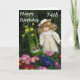 Vacker 74-årsdagskort med söt liten docka och färggranna primula och påskliljor.