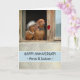 Söt gratulationskort för årsdagen med ett fotografi av ett Dachshund-par som tittar ut genom ett fönster. Bruden bär en brudhatt och pärlhalsband. Brudgummen bär en fluga och håller en röd ros i munnen. Lägg till parets namn på omslaget för en anpassad look. Konst, bild och vers copyright © Shoaff Ballanger Studios, 2022.