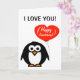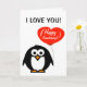 Grattis på årsdagen gratulationskort med söt pingvin som håller en röd hjärtsballong.