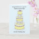 En stilren tre våningar hög bröllopstårta i pastellfärger mot en blekblå bakgrund. Orden "Grattis till en speciell brorson och hans fru på deras bröllopsdag".