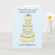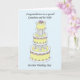 Stor, flerskiktig, citronfärgad bröllopstårta på en blekblå bakgrund med orden 'Till en underbar sonson och hans fru på deras bröllopsdag'.