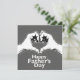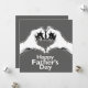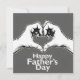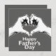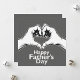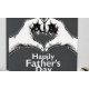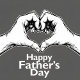 En svart-vit illustration av två händer som formar en hjärtform med texten "Grattis på fars dag" skriven nedan i feta bokstäver mot en enfärgad bakgrund!