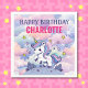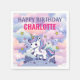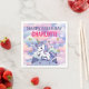 Skadliga magiska pappra blöjor för att fira din födelsedag. Ett pastellmoln av mönster napkin med en söt tecknad dragen encorn. Hon har en färglös mane och svan i pastellblåsor, pinkar och lila, en gult horn på krona i huvudet, en vit kropp och lila hovar. Hon står på lila gräs med lila buskar i bakgrunden och omges av färgstarka stjärnor. I den lila texten överst på napkin finns ord "Grattis på födelsedagen" och under detta i den rosa texten finns en mall som du kan använda för att anpassa detta söta tillägg till firandet i party.