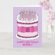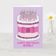 En stor rosa- och vit tecknad-tårta mot en god bakgrund, med flera ljus på den. Ord "Grattis på födelsedagen Beverly" följer med bilden.