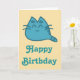 En söt tecknad teckning av en blå leende kattunge med grattis på födelsedagen skrivet på framsidan med ett meddelande inuti.