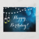 En romantisk mörk och blå kväll och natt med fullt och ljussträngar. Två målade mason burk med ljus. Med texten: Grattis på födelsedagen!