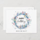 Önska dina kunder en trevlig födelsedag i år med detta söta vykort med bedårande hus, ballonger och en vacker blomsterkrans.