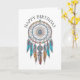 Ai-konst som skildrar en söt blå och brun boho mystical dreamcatcher med pärlor och fjädrar. Andlig födelsedagskort.