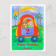 Ett eget vykort för roligt med en liten pojke i lycklig och hans flytande hund som kör i en färglös bil i leksak utanför en sommardag med sol som pissar ut de moln som illustreras med vattenfärg. Ett trevligt sätt att säga grattis på födelsedagen till en speciell pojke som du kan anpassa med namn och ålder!